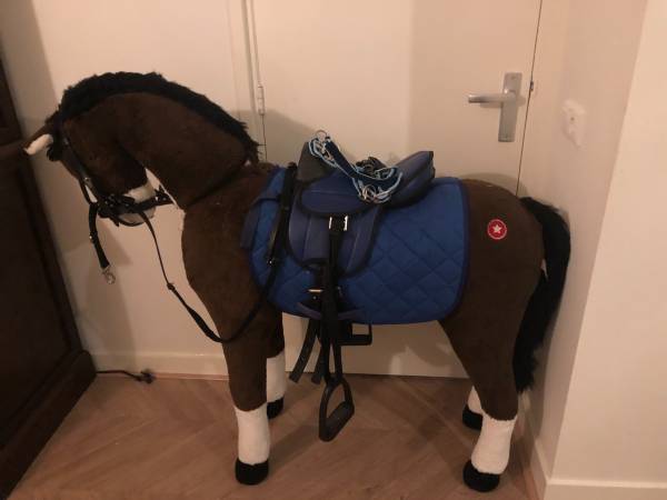 Toy horse that can hold up to 100kg, the horse makes sounds too. Brand new bought the horse for 300 Euro. The head needs to be glued or stitched on.